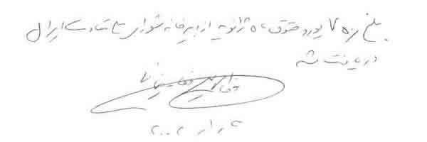 من تاكید میكنم كه با رضایت،چنین پرداختی را بعنوان حل و فصل نهایی تمام تعهدات شخص تو به خودم محسوب می كنم و بدیهی است كه كلیه پرداخت ها مالی من در رابطه با مقولات شرافتمندانه ای بوده است كه تو به من معرفی كردی.