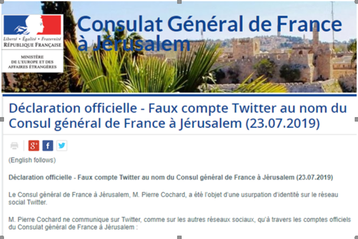 وزارتخارجه فرانسه اطلاعيه رسمي ”كنسولگري فرانسه در اورشليم” را تحت عنوان «حساب توييتري قلابي از سوي سركنسول فرانسه در بيت المقدس» منتشر و اعلام كرد: «سركنسول فرانسه در بيت المقدس اقاي پير كورشارد سوژه يك دزدي هويت در شبكه اجتماعي توييتر واقع شده است. آقاي پير كوشارد روي توييتر همچنانكه روي ديگر شبكه هاي اجتماعي، تنها از طريق حساب توییتری كنسولگري فرانسه در بيت المقدس ارتباط بر قرار ميكند».