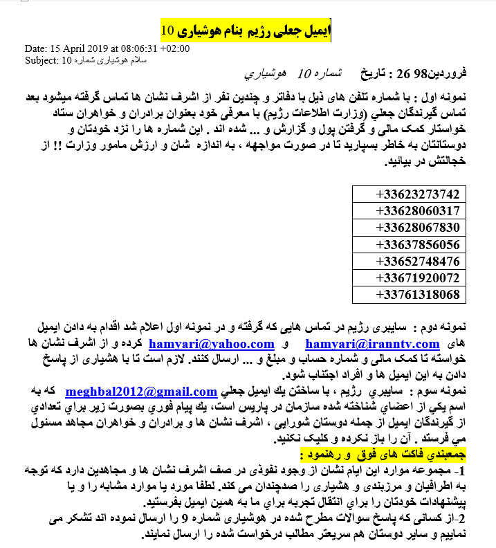 11-در فروردين 98 سايبري رژيم با يك ايميل به نام ”آرمان سرفراز “ arman.sarfraz1340@gmail.com براي قدرتنمايي آخوندي و ايجاد جو بي اعتمادي، تلاش ميكرد چنين جلوه دهد كه در صفوف مجاهدين نفوذي هاي زيادي دارد. در همين رابطه با يك كپيبرداري و تقليد ناشيانه در يك متن تحت عنوان «شماره 10 هشياري» كه براي هواداران ارسال شده بود، نوشت: «مجموعه موارد اين ايام نشان از وجود نفوذي در صف اشرف نشان ها و مجاهدين دارد كه توجه به اطرافيان و مرزبندي و هشياري را صد چندان ميكند». در همين متن با سرهم بندي كردن خبرهاي دروغ، براي جلب اعتماد مخاطب به معرفي برخي ايميلهاي رژيم و چند شماره تلفن به عنوان تلفنهاي مشكوك شده بود كه گوئيا « با اشرف نشانها تماس گرفته و خواستار كمك مالي ميشوند». غافل از اينكه كمكهاي مالي ياران اشرف نشان هرگز با چنين شيوههايي صورت نميگيرد.