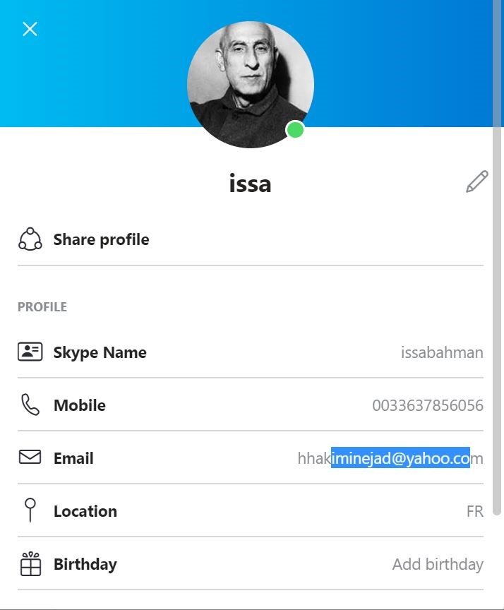 15-سايبري آخوندها، اقدام به ايجاد يك آي دي اسكايپ جعلي بنام ISSA نموده است كه مشابه يكي از آي دي هاي مورد استفاده مقاومت در شبكه اسكايپ است. هدف تخليه اطلاعاتي هواداران مقاومت بود كه با هوشياري آنها خنثي شد.
