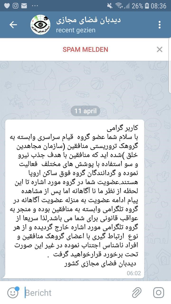 16-يك غلط اضافي اطلاعات آخوندها ارسال پيامهاي تهديد آميز توخالي براي هواداراني است كه روي شبكه هاي تلگرامي فعال هستند. در يكي از پيامهايي كه از طرف «ديدبان فضاي مجازي» رژيم براي كاربران ارسال شده آمده است : «كاربر گرامي- شما وارد گروه قيام سراسري وابسته به منافقين(سازمان مجاهدين خلق) شده ايد ... عضويت شما در گروه مورد اشاره تا اين لحظه از نظر ما نا آگاهانه اما پس از مشاهده پيام ادامه عضويت به منزله عضويت آگاهانه در گروه تلگرامي وابسته به منافقين بوده و منجر به عواقب قانوني براي شما ميباشد....» .