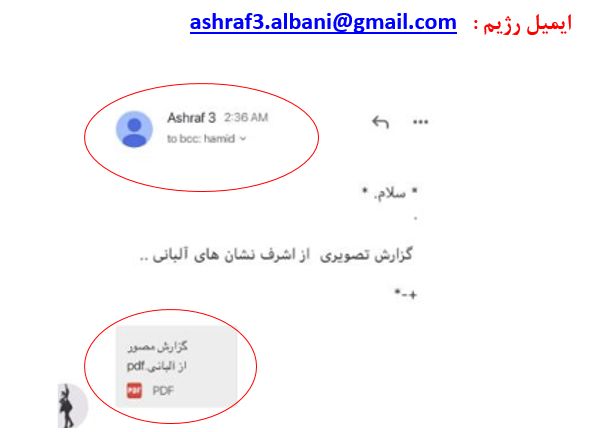 9-در ارديبهشت 98 دشمن از طريق يك ايميل مجعول با نام ”اشرف3 آلباني“ ashraf3.albani@gmail.com يك سند پي دي اف تحت عنوان « گزارش تصويري از اشرف نشان هاي آلباني …» ارسال كرد. اين سند حاوي ويروس بود كه در صورت كليك روي آن وارد سيستم كامپيوتر شده و اطلاعات كامپيوتر را تخليه ميكرد.