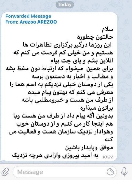 8-در ارديبهشت و خرداد98 كاربري با نام جعلي ” آرزو“ ( Arezoo AREZOO) كه خودش را به عنوان يكي از مسئولان مجاهدين كه مسائل اشرف نشان ها را دنبال ميكند معرفي ميكرد، با شمار زيادي از هواداران تماس ميگرفت و مطرح ميكرد از آنجا كه الان خودش درگير تظاهرات پي درپي است و فرصت كمي دارد، فردي بنام « هما » جايگزين او خواهد بود. مامور بعدی که خود را هما معرفی میکرد، با سوالات مختلف در صدد كسب اطلاعات از مقاومت بود از جمله مي نوشت « ميخواستم بدونم شما كسي رو توي ايران كه بتونم باهاش صحبت كنم ميشناسي و ميتوني معرفي كني، هركسي در هر كجا كه خودتون فكرميكنيد ميتونه با ما رابطه داشته باشه حتي خبر بده يا كوچكترين كاري رو انجام بده ممنون ميشم».