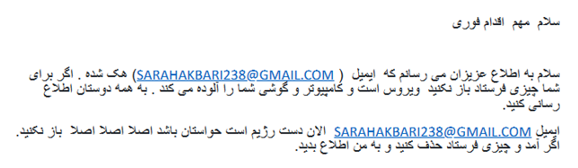 در چنين شرايطي وزارت اطلاعات،سپاه تروريستي پاسداران و نيروي قدس با به كار گرفتن ماشين تبليغاتي و سايبري خود مذبوحانه به مقابله برخاستهاند. شيطان سازي، پخش اطلاعات و خبرهاي دروغ، به كار گرفتن ایمیلهاي مجعول، ارسال ایمیلهای تهدید آمیز، ارسال ويروس براي هك كردن كامپيوترها و ايميلهاي اعضا و پشتيبانان مقاومت، روشهاي شناختهشده ارگانهاي سركوبگر رژيم پليد آخوندي است. به منظور هوشياري هموطنان برخي نمونهها به اطلاع ميرسد :