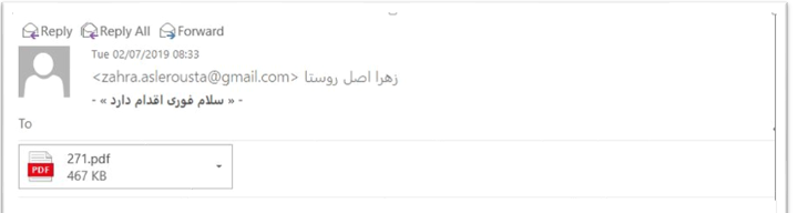 7-سايبري دشمن در تیر ۹۸ با سوء استفاده از اسم يكي از هواداران مجاهدين از طريق ايميل ” زهرا اصل روستا“ Zahra.aslerousta@gmail.com پيامي ارسال نمود كهيك سند پي دي اف ضميمه آن بود. در پيام عنوان كرده بود كه سند حاوي سوالاتي است كه از اشرف نشان ها ميخواست پاسخ آنرا برايش ارسال كنند. اين سند پي دي اف حاوي ويروس بود و با هدف هك كردن و سرقت اطلاعات كامپيوترهاي ديگران تنظيم و ارسال شده است.