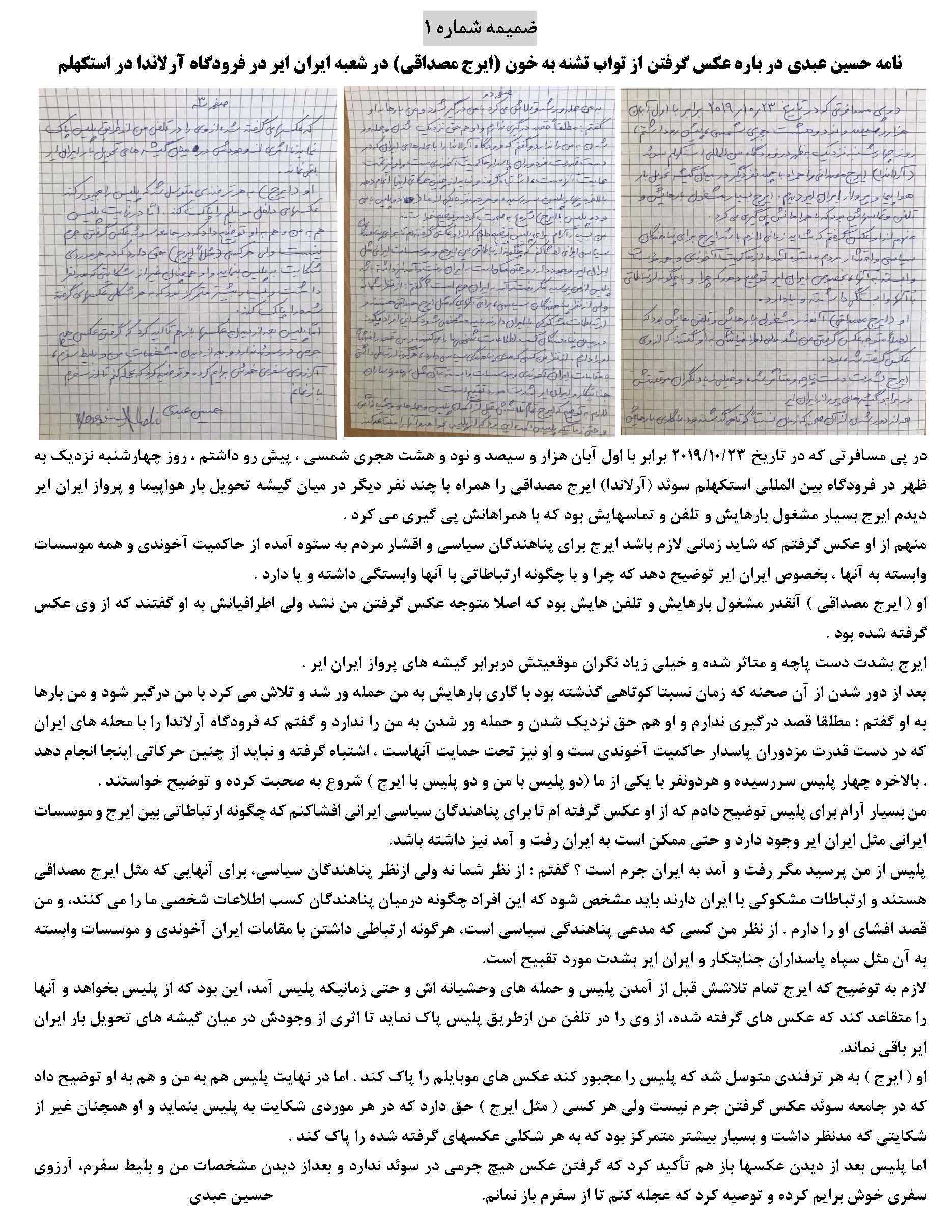1-كميسيون امنيت و ضدتروريسم شوراي ملي مقاومت نامه آقاي حسين عبدي هوادار مجاهدين در باره عكس گرفتن از مزدور ايرج مصداقي را در برابر ايران اير در فرودگاه آرلاندا به اطلاع عموم ميرساند (ضميمه شماره 1) .