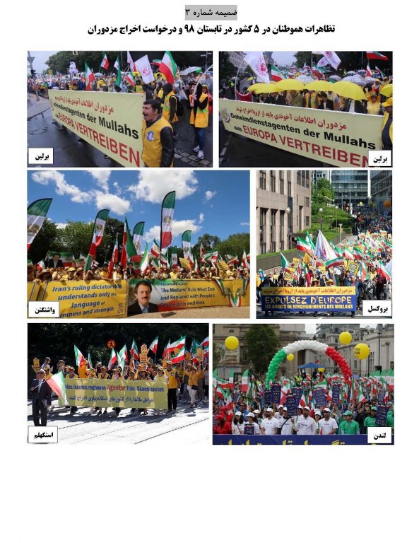 3-كميسيون خواستة هموطنانمان در تظاهرات تابستان امسال در بروكسل، واشنگتن، برلين، استكهلم و لندن را در مورد ضرورت محاكمه و مجازات مزدوران و اخراج عوامل اطلاعات رژيم مورد تأكيد قرار ميدهد و تا ريشهكني تام و تمام وزارت بدنام و اطلاعات سپاه جهل و جنايت بر آن پا ميفشارد (ضميمه شماره 3).