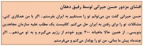 حسن حیرانی گفت چرا جای دیگری میخواهی بروی من میتوانم تو را مستقیم به ایران بفرستم و مرا تشویق کرد که نزد او باشم و با او همکاری کنم و همخانه او بشوم تا مسائل مرا حل کند. او گفت تو با من همکاری کن من مشکلات تو را برای رفتن به ایران حل میکنم بعد گفت کافی است یک مطلب علیه سازمان مجاهدین بنویسی و من در سایت برایت بزنم.