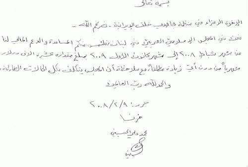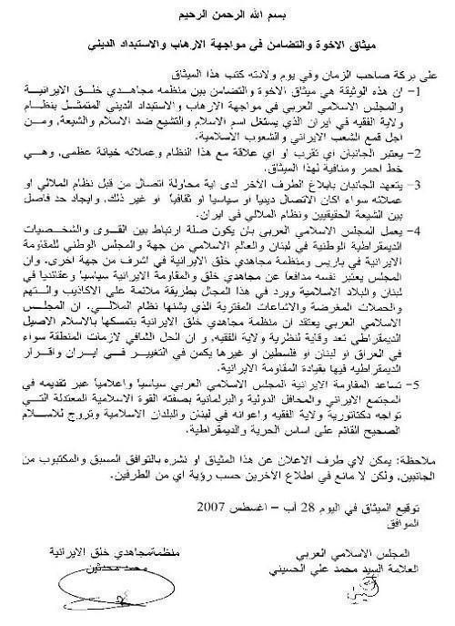 آخوند حسینی كه قبلاً حدود یك دهه در قم بسر برده و عضو حزب الشیطان بوده است پس از خروج از ایران و موضعگیری در برابر حزب الشیطان، در همبستگی با سازمان مجاهدین خلق ایران متعهد به «مقابله با تروریسم و استبداد دینی كه در رژیم ولایت فقیه ایران تجسم یافته » گردید و تصریح كرد « هرگونه نزدیكی یا هر رابطهای با این رژیم و مزدورانش را خیانت بزرگ» بشمار می آورد (سند به تاریخ 28 اوت 2007 ضمیمه است).