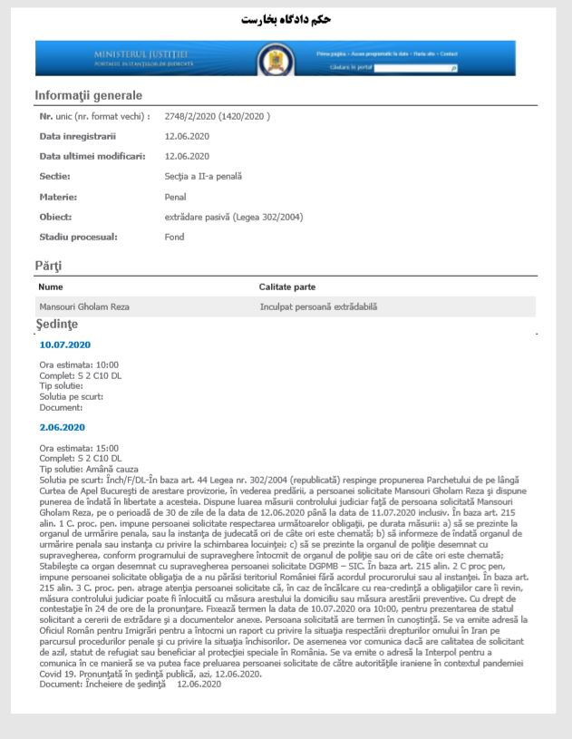 کمیسیون امنیت و ضد تروریسم خلاصه حکم دادگاه استیناف بخارست را به اطلاع هموطنان میرساند و از هموطنان مقیم رومانی که طبق قوانین این کشور میتوانند از دژخیم منصوری شکایت کنند میخواهد در اسرع وقت دست به کار و مانع زد و بند و فراری دادن جنایتکار شوند.