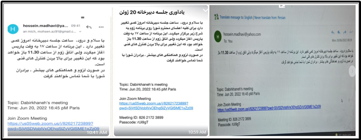 «باسلام ودرود، ساعت جلسه دبيرخانه امروز كمي تغيير دارد. اين برنامه ازساعت ۱۷ به وقت پاريس آغاز ميگردد ولي اتاق زوم ازساعت ۱۱.۳۰ باز خواهد بود كه اين تغيير براي بالابردن كنترلهاي فني است. درصورت لزوم و هماهنگي هاي بيشتر، برادران شورا با شما تماس خواهند گرفت». در اين ايميل از اسم madhavi استفاده شده و جاي حرف h وd عوض شده است.