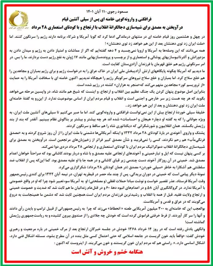 مسعود رجوی: فرافکنی و وارونهگویی خامنهای پس از سیلی آتشین قیام در آویختن به مصدق برای شبیهسازی دجالگرانه انقلاب با ارتجاع و با کودتای استعماری ۲۸مرداد