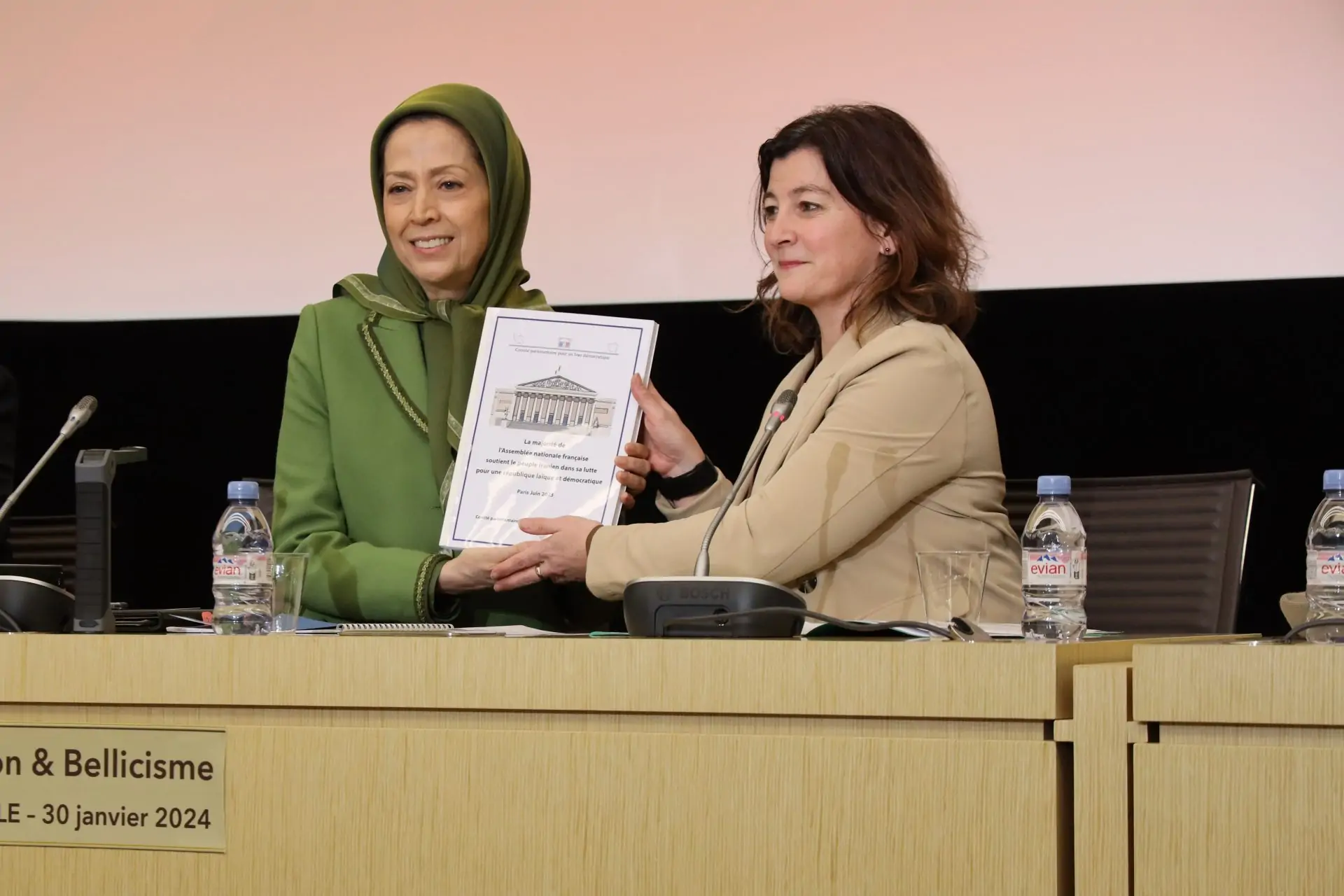 روز سه شنبه ۱۰بهمن به دعوت کمیته پارلمانی برای ایران دموکراتیک، مریم رجوی در سالن ویکتورهوگوی مجلس ملی فرانسه حضور یافت و در جمع گروهی از نمایندگان مجلس و شخصیتهای سیاسی سخنرانی کرد. در این جلسه، سسیل ریلاک، نماینده مجلس ملی فرانسه از گروه اکثریت رنسانس و رئیس کمیته پارلمانی برای ايران دموکراتيک، آندره شاسین، رئيس گروه کمونیستها، فیلیپ گوسلن، هروه سولینیاک و یانیک فاونیک نایب رئیسان کمیته پارلمانی برای ایران دموکراتیک شرکت داشتند و سخنرانی کردند. علاوه بر نمایندگان مجلس ملی فرانسه، شخص