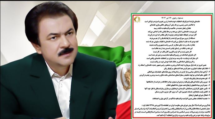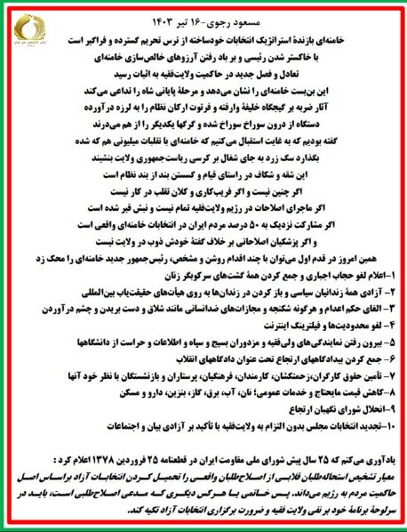 مسعود رجوی - ۱۶ تیر ۱۴۰۳: خامنهای بازندهٔ استراتژیک انتخابات خودساخته از ترس تحریم گسترده و فراگیر است