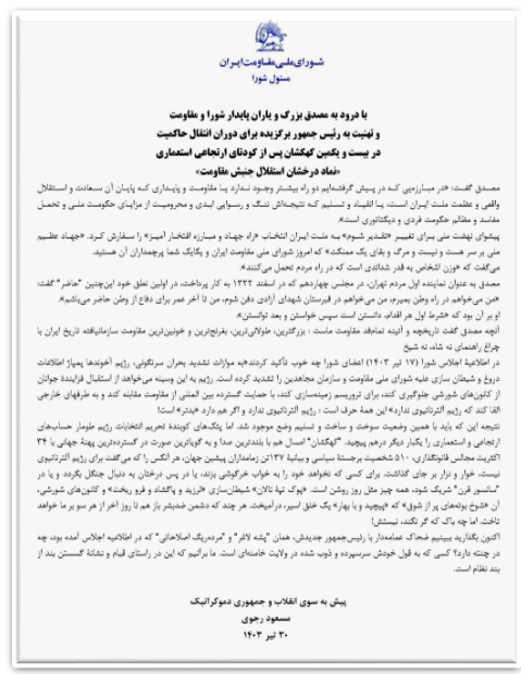 پیام مسئول شورا بادرود به مصدق بزرگ و یاران پایدار شورا و مقاومت و تهنیت به رئیس جمهور برگزیده برای دوران انتقال حاکمیت