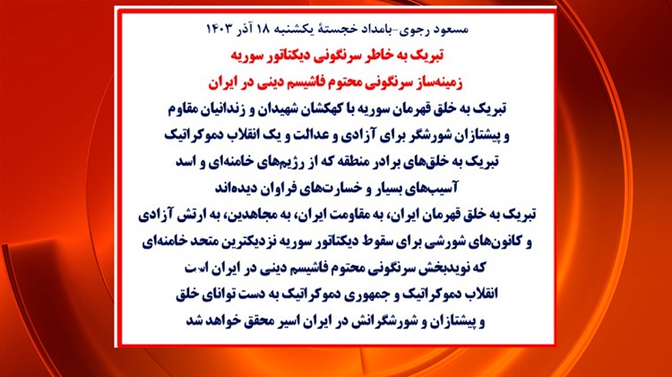 برای شنیدن پیام روی آن کلیک کنید مسعود رجوی-بامداد خجستة یکشنبه ۱۸ آذر ۱۴۰۳ تبریک به خاطر سرنگونی دیکتاتور سوریه زمینهساز سرنگونی محتوم فاشیسم دینی در ایران تبریک به خلق قهرمان سوریه با کهکشان شهیدان و زندانیان مقاوم و پیشتازان شورشگر برای آزادی و عدالت و یک انقلاب دموکراتیک تبریک به خلقهای برادر منطقه که از رژیمهای خامنهای و اسد آسیبهای بسیار و خسارتهای فراوان دیدهاند تبریک به خلق قهرمان ایران، به مقاومت ایران، به مجاهدین، به ارتش آزادی و کانونهای شورشی برای