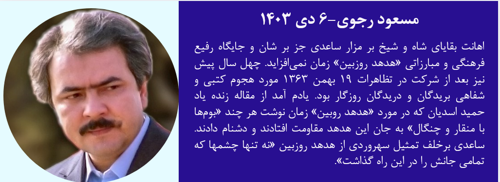 اهانت بقایای شاه و شیخ بر مزار ساعدی جز بر شأن و جایگاه رفیع فرهنگی و مبارزاتی «هدهد روزبین» زمان نمیافزاید. چهل سال پیش نیز بعد از شرکت در تظاهرات ۱۹ بهمن ۱۳۶۳ مورد هجوم کتبی و شفاهی بریدگان و دریدگان روزگار بود. یادم آمد از مقاله زنده یاد حمید اسدیان که در مورد «هدهد روزبین» زمان نوشت هر چند «بومها با منقار و چنگال» به جان این هدهد مقاومت افتادند و دشنام دادند، ساعدی برخلاف تمثیل سهروردی از هدهد روزبین «نهتنها چشمها که تمامی جانش را در این راه گذاشت».