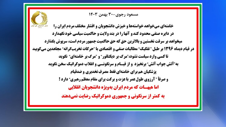 خامنهای میخواهد خواستهها و خیزش دانشجویان و اقشار مختلف مردم ایران را در دایره صنفی محدود کند و آنها را در بند ولایت و حاکمیت سیاسی خود نگهدارد میخواهد بر سرقت نخستین و بالاترین حق که حق حاکمیت جمهور مردم است، سرپوش بگذارد در قیام دیماه ۱۳۹۶ بر طبل ” تفکیک“ مطالبات صنفی و اقتصادی با ”حرکات تخریبگرانه“ مجاهدین میکوبید تا کسی وارد سیاست نشود،”مرگ بر دیکتاتور“ و ”مرگ بر خامنهای“ نگوید به”آتش جواب آتش“ برنخیزد و از قیـام و سرنگونـی و انقلاب دموکراتیک سخن نگوید پزشکیان هم برای خامنهای فقط مصرف تخدیری و ضدقیام و صرفاً ” آرزوی طول عمر با عزت و برکت برای مقام معظم رهبری“ دارد ! اما هیهـات که مردم ایران بهویژه دانشجویان انقلابی به کمتر از سرنگونی و جمهوری دموکراتیک رضایت نمیدهند