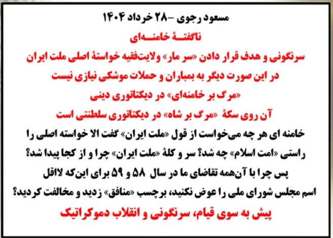 مسعود رجوی -۲۸ خرداد ۱۴۰۴ ناگفتـهٔ خامنـهای سرنگونی و هدف قرار دادن «سر مار» ولایت فقیه خواسته اصلی ملت ایران در این صورت دیگر به بمباران و حملات موشکی نیازی نیست «مرگ بر خامنهای» در دیکتاتوری دینی آن روی سکهٔ «مرگ بر شاه» در دیکتاتوری سلطنتی است خامنهای هر چه میخواست از قول «ملت ایران» گفت الا خواسته اصلی را راستی «امت اسلام» چه شد؟ سر و کلهٔ «ملت ایران» چرا و از کجا پیدا شد؟ پس چرا با آنهمه تقاضای ما در سال ۵۸ و ۵۹ برای اینکه لااقل اسم مجلس شورای ملی را عوض نکنید، برچسب «م