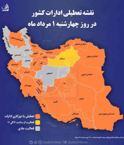 با ادامه موج بیسابقه گرما، رژیم آخوندها ناتوان از حل مسأله آب و برق، به تعطیلی ادارات، بانکها، مراکز دولتی و آموزشی روی آورده است. طبق نقشهای که در رسانههای حکومتی منتشر شده است، روز چهارشنبه ۲۴ استان از ۳۱ استان کشور تعطیل است.