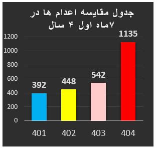 ۱۱۳۵ اعدام در ۷ ماه اول ۱۴۰۴ با افزایش ۱۱۰ درصدی نسبت به ۱۴۰۳ شامل ۳۶ زن و ۶ کودک مجرم