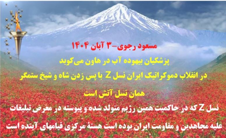 مسعود رجوی - ۳ آبان ۱۴۰۴ مسعود رجوی - ۳ آبان ۱۴۰۴ پزشکیان بیهوده آب در هاون میکوبد در انقلاب دموکراتیک ایران نسل Z با پس زدن شاه و شیخ ستمگر همان نسل آتش است نسل Z که در حاکمیت همین رژیم متولد شده و پیوسته در معرض تبلیغات علیه مجاهدین و مقاومت ایران بوده است هستهٔ مرکزی قیامهای آینده است